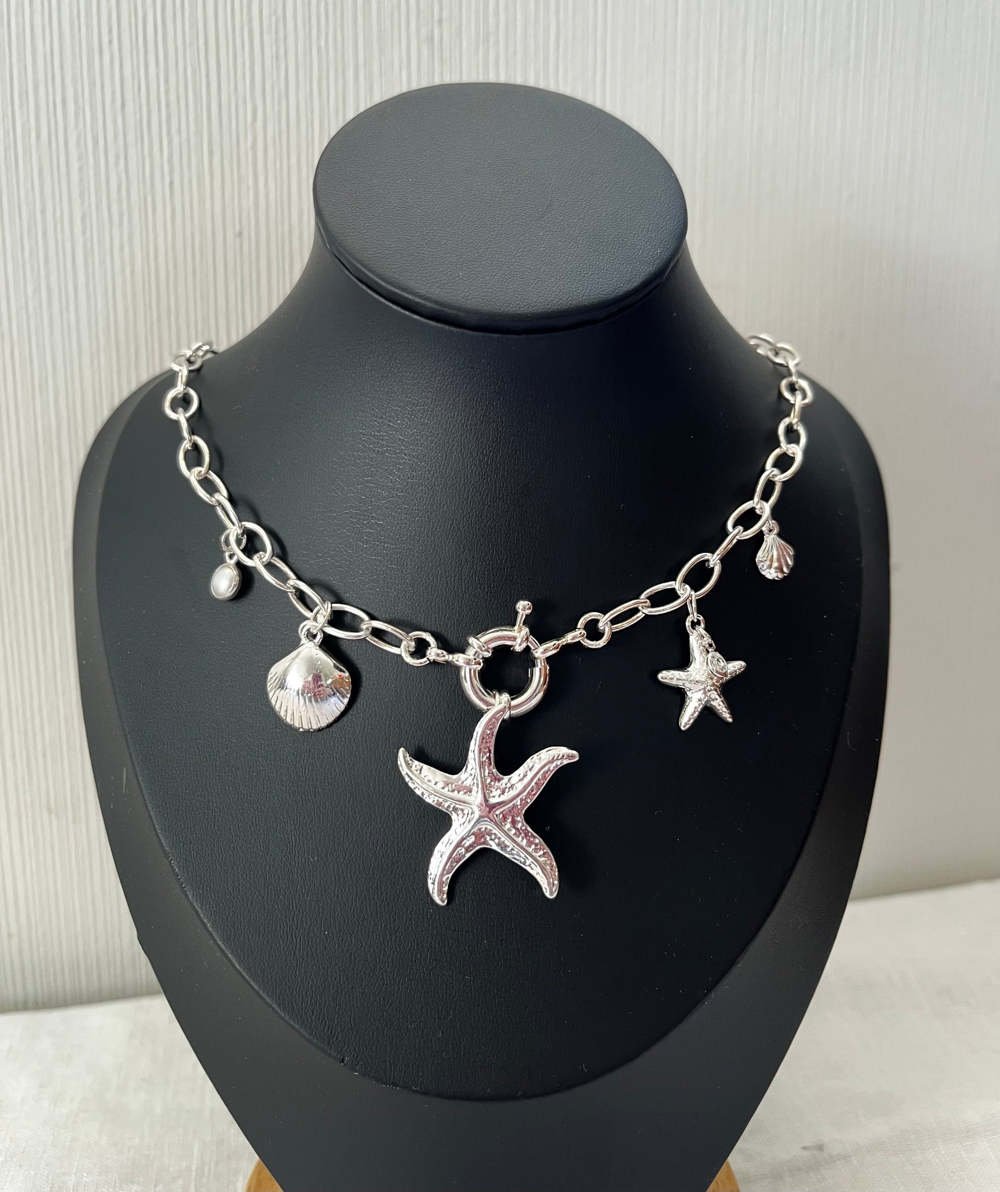 Collar único hecho a mano con cadena enchapada en plata 950 con dijes enchapados en plata 950.
