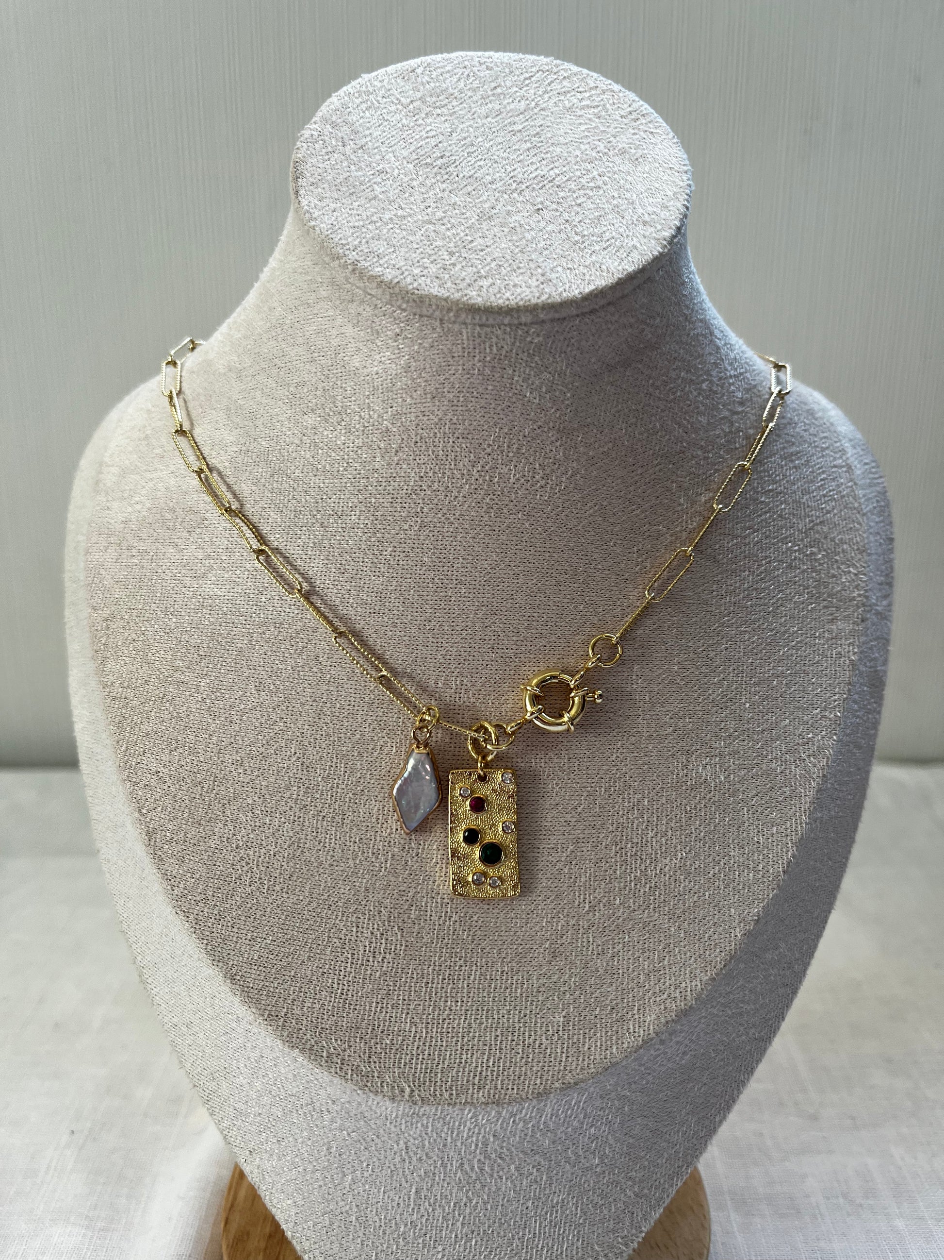 Collar único hecho a mano con cadena enchapada en oro, broche timón, pieza rectangular enchapada en oro con circones de colores y un rombo de perla de rio natural.